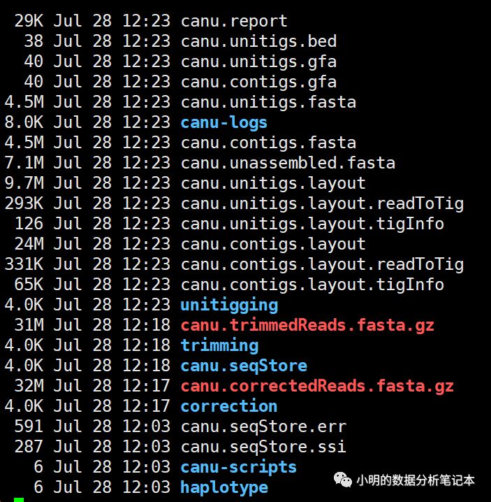 canu.contigs.fasta 组装结果canu.unassembled.fasta 没有被用于组装的readscanu.correctedReads.fasta.gz 用于组装的经过矫正的readscanu.file.gfa the graph of the assembly.