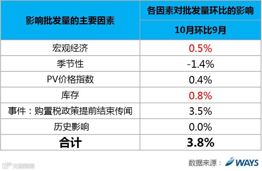 影响10月批发量变化的关键因素是购置税政策提前结束传闻、库存和宏观经济。