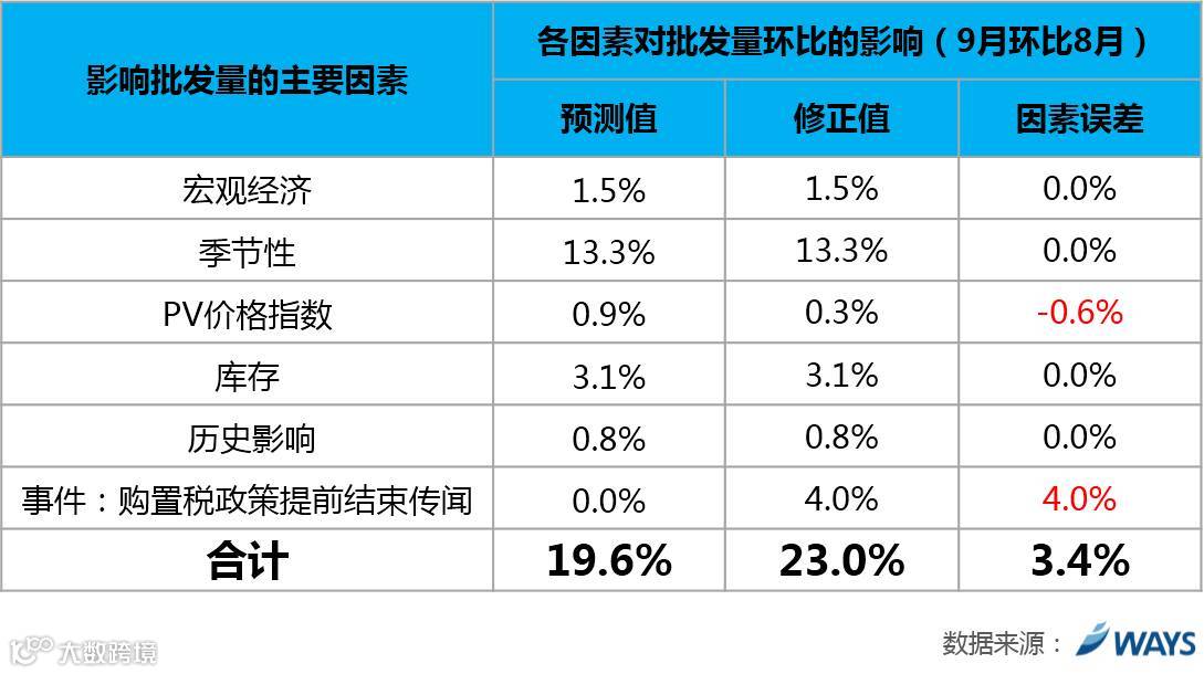 将影响批发量的主要因素进行分解,并根据实际值与预测值的误差分析可知,“购置税政策提前在10月底结束”传闻的出现、价格降幅的高估是因素误差的主要原因。(如下图所示)