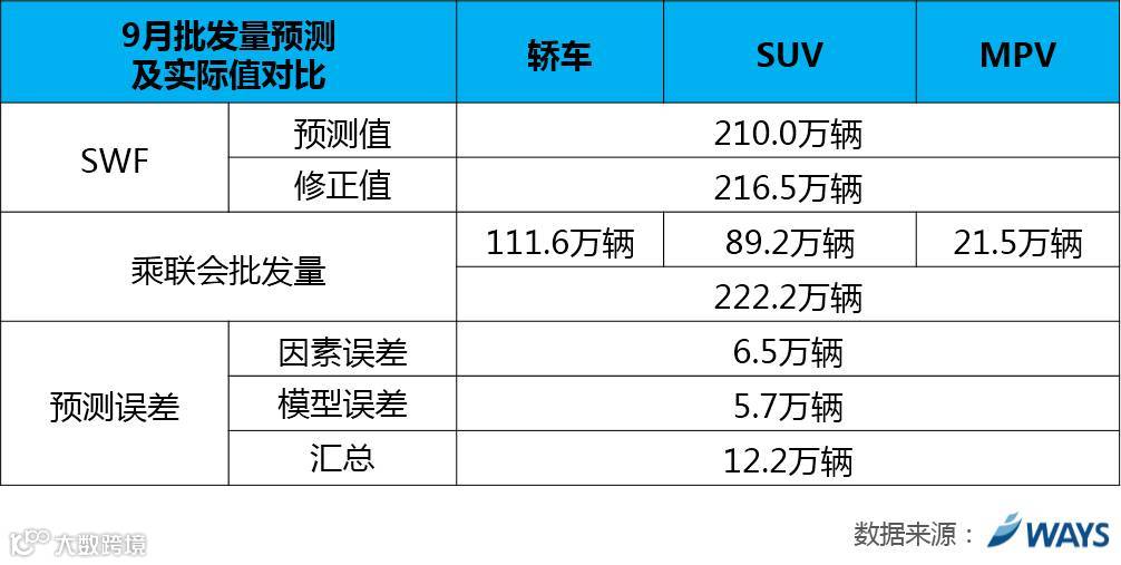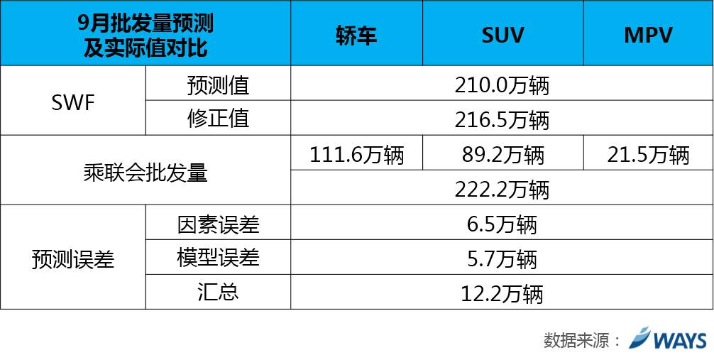 这与威尔森公布的9月预测值相差12.2万辆,误差百分比为5.5%。其中,模型误差为6.5万辆,误差百分比为2.9%;因素误差为5.7万辆,误差率百分比为2.6%。(如下图)