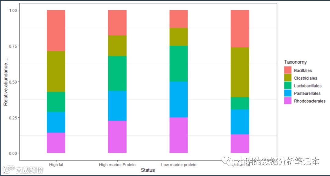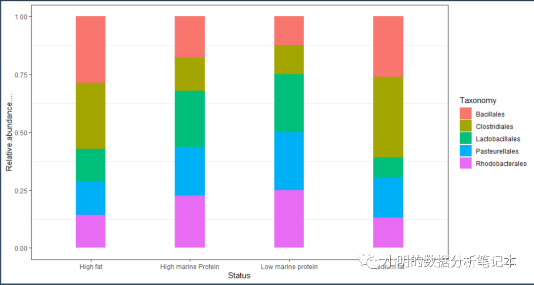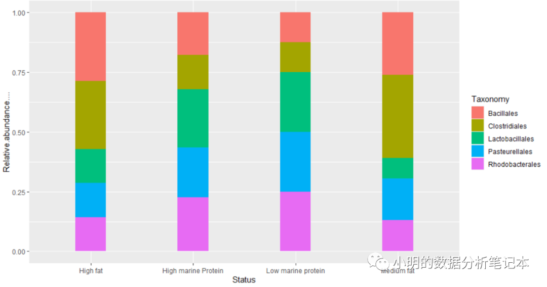 ggplot(df,aes(x=Status,y=Relative.abundance....,fill=Taxonomy)) + geom_bar(stat = 'identity', width = 0.3, position = 'fill')+theme_set(theme_bw())+theme(panel.grid.major=element_line(colour=NA))