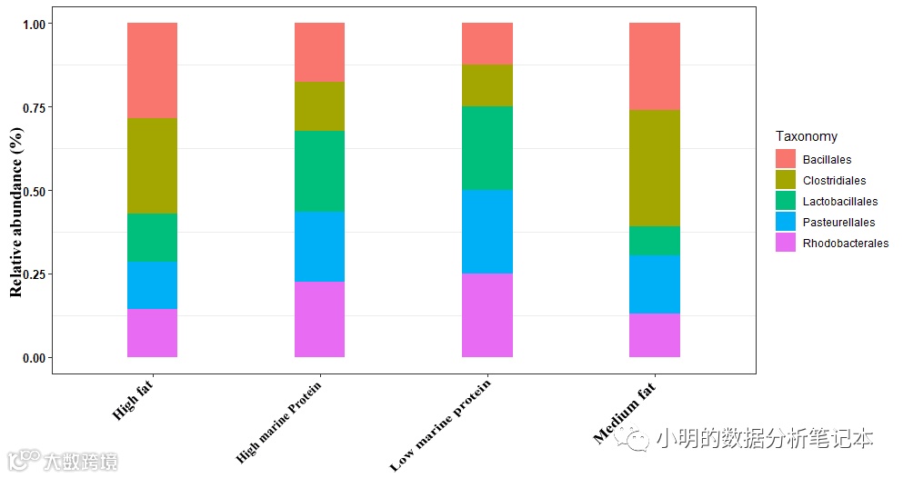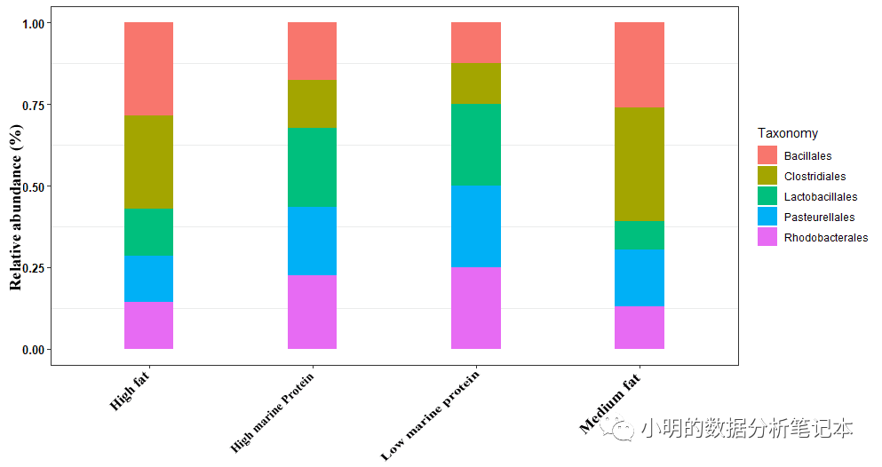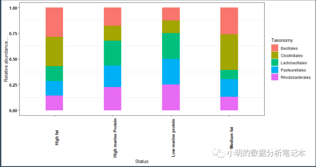 p0<-ggplot(df,aes(x=Status,y=Relative.abundance....,fill=Taxonomy)) + geom_bar(stat = 'identity', width = 0.3, position = 'fill')+theme_set(theme_bw())+theme(panel.grid.major=element_line(colour=NA))+theme(axis.text.x = element_text(face="bold", color="black", size=10, angle=45), axis.text.y = element_text(face="bold", color="black", size=10))+theme(axis.title.x=element_blank())+ theme(axis.text.x = element_text(angle = 45, hjust = 0.4, size = 10, vjust=0.4))