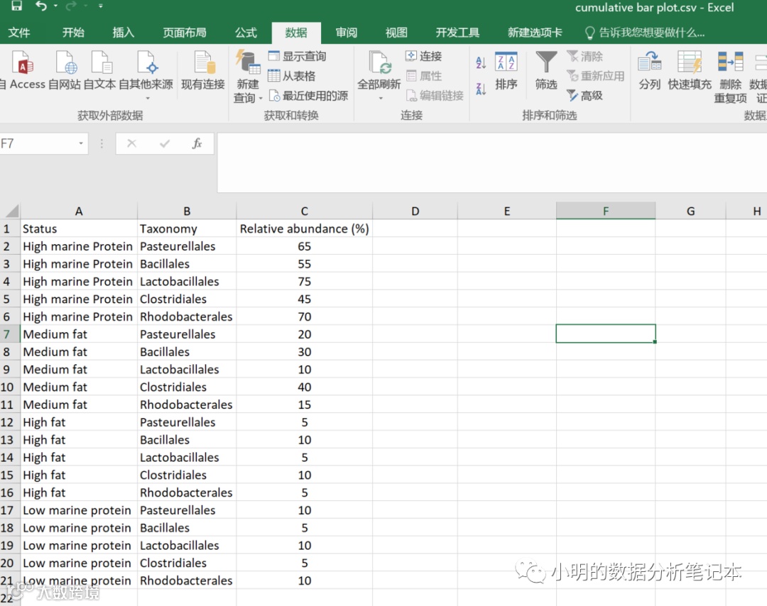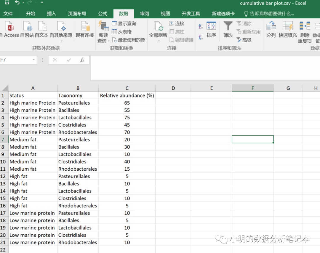 数据准备:一般可视化最重要的一部分就是数据的准备,请看以下图,给出了对应的数据内容,以下简作说明:第一列:是分组,即共四个组。第二列:每个组里的不同物种。第三列:每个分组里的每个物种的相对丰度。