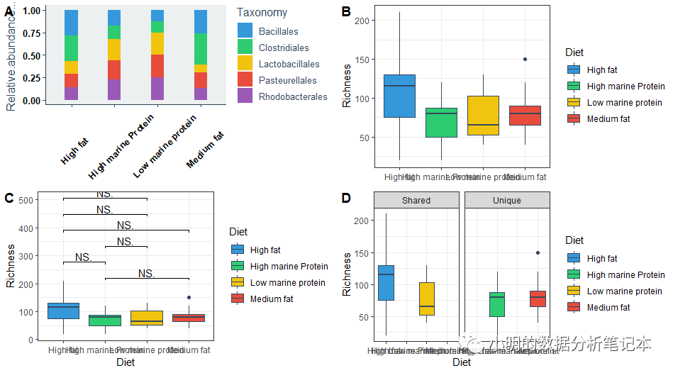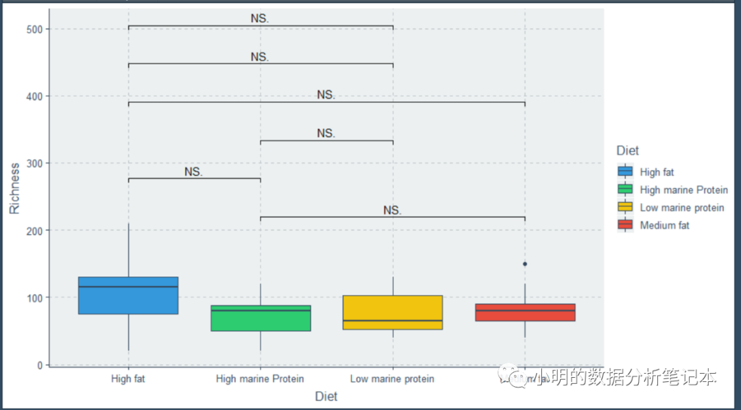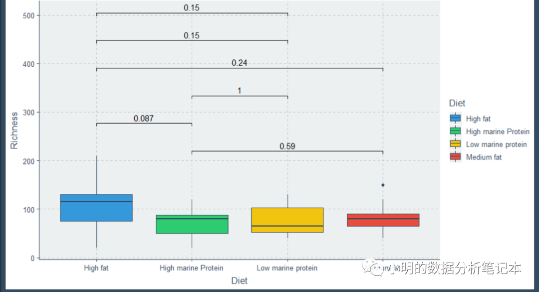 p2 <- ggplot(bp, aes(Diet, Richness, fill = Diet)) + geom_boxplot() + geom_signif(comparisons = compaired, step_increase = 0.3, map_signif_level = F, test = wilcox.test)