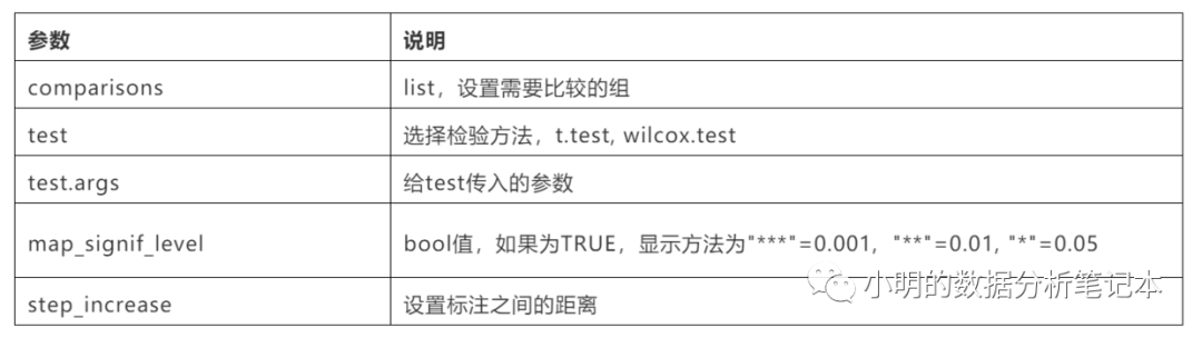 ggsignif主要的一个函数是geom_signif(),使用方法和ggplot2中其他的geom_***()一样,作为图层添加到图形中就可以,他的主要参数为: