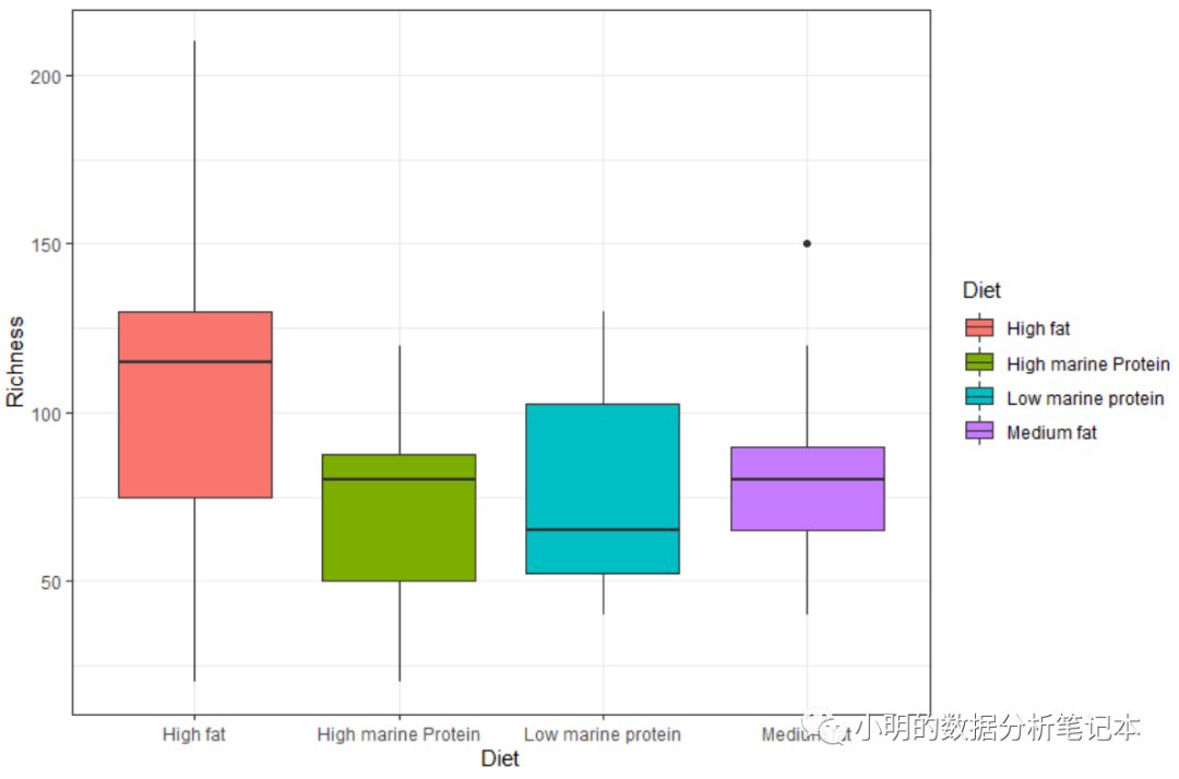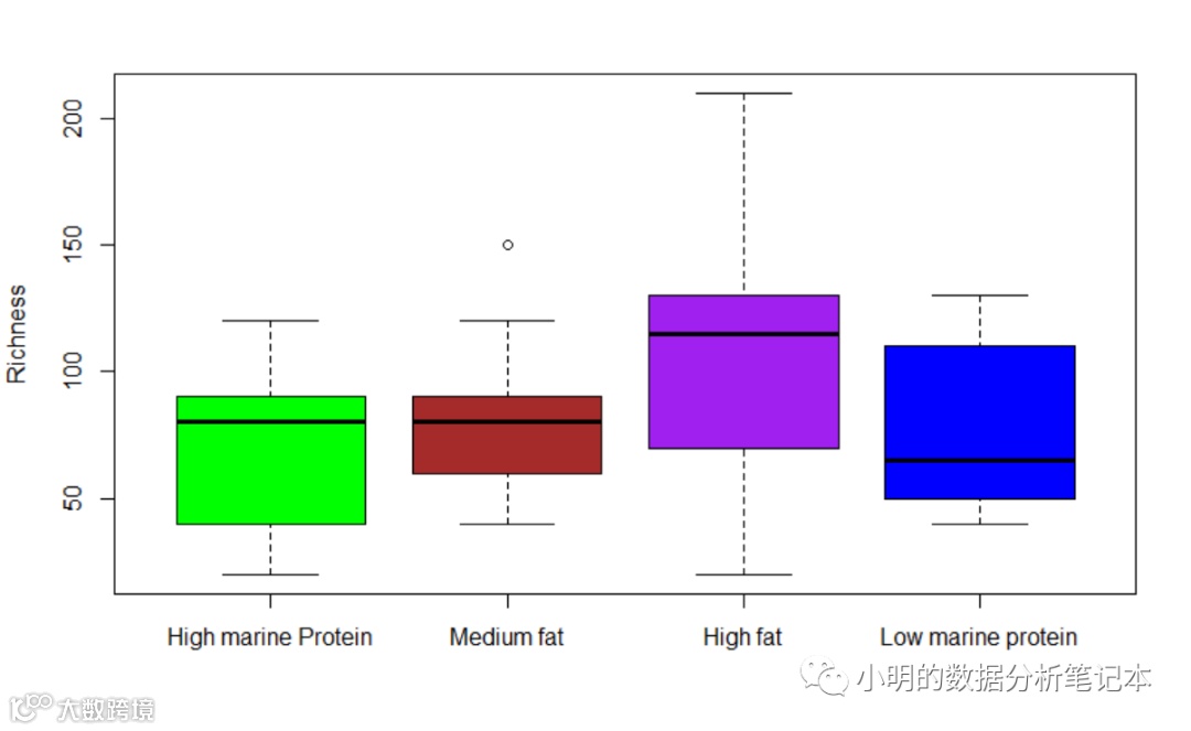 boxplot(bp, col = c("green","brown","purple","blue"),names = c("High marine Protein","Medium fat","High fat","Low marine protein"), ylab = "Richness")