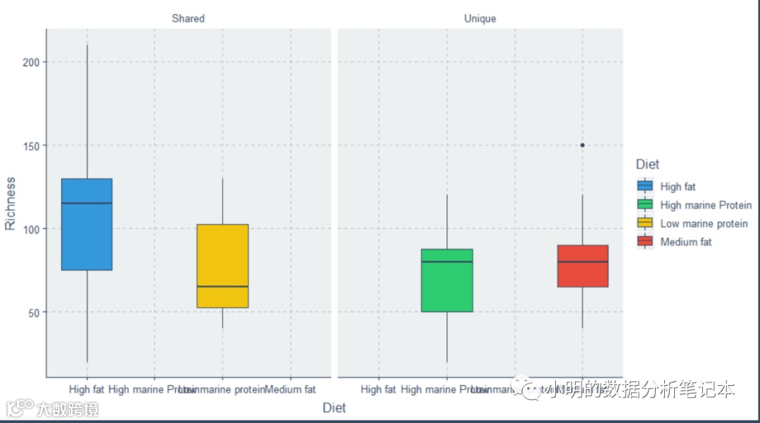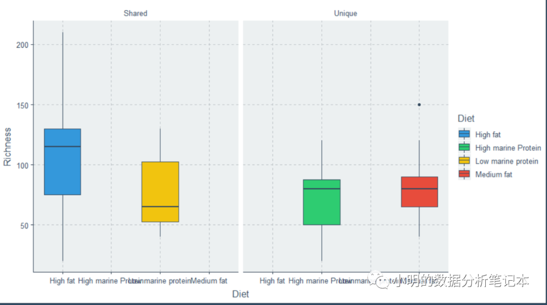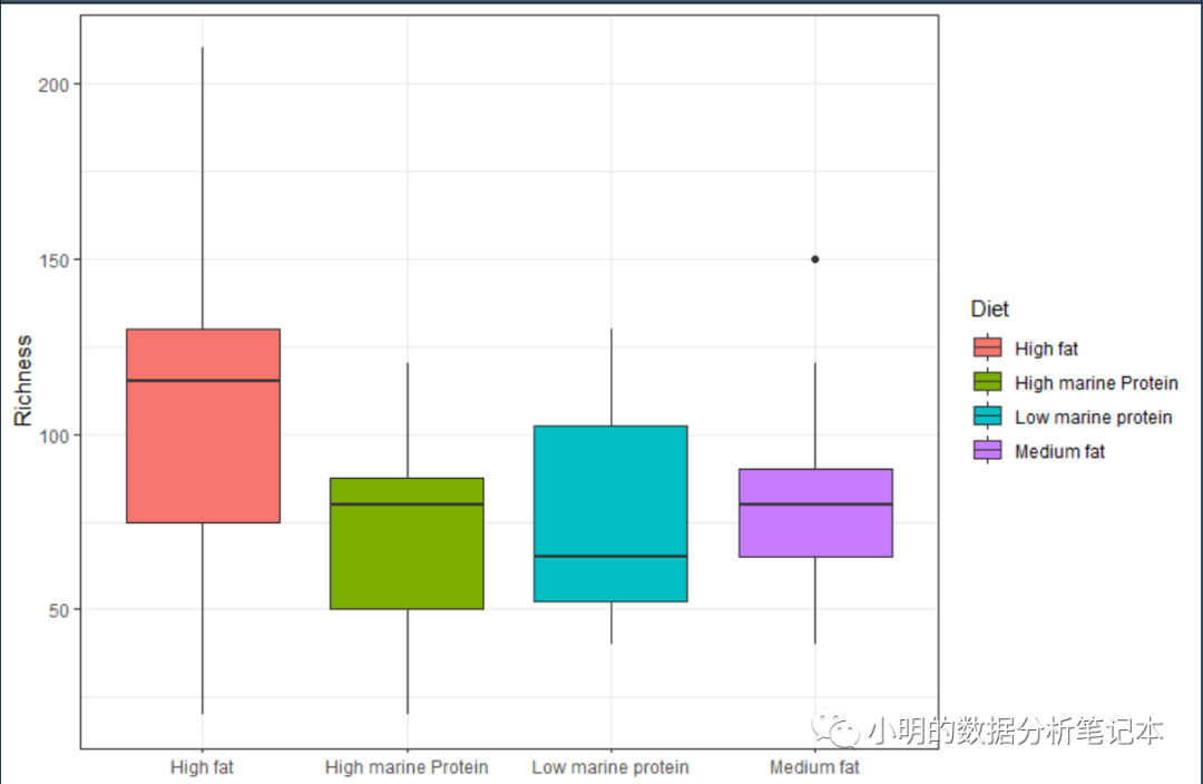 解释:boxplot(bp#选择上面的dataframe, col = c(#给每个箱图选择颜色,用英文标点双引号!"green","brown","purple","blue"),names = c(#给每个箱子命名"High marine Protein","Medium fat","High fat","Low marine protein"), ylab = #给纵轴起名"Richness") 得到: