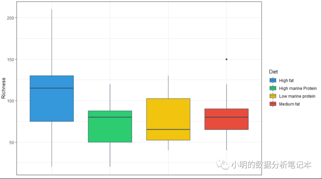 p1<-ggplot(bp, aes(x=Diet, y=Richness, fill=Diet)) + geom_boxplot()+theme(axis.title.x=element_blank())