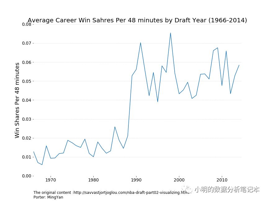 Out[44]: Text(1966,-0.012,'The original content :http://savvastjortjoglou.com/nba-draft-part02-visualizing.html\nPorter: MingYan')