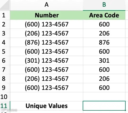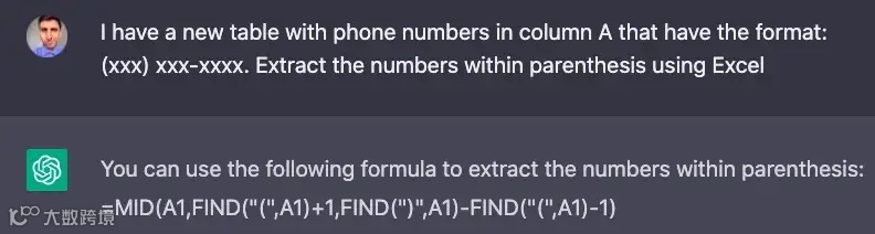 接下来我们数一下列 B 中有多少唯一的区号(area codes)。如下图所示,ChatGPT 生成了非常复杂的公式,但这些公式不起作用。究其原因,可能是 ChatGPT 记住了对话中的每一个细节。我们可以试着提问一个一般性的问题来解决: