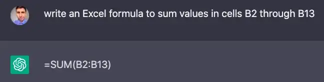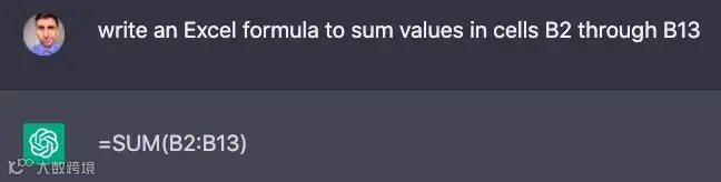 在这种情况下(当我们想要对一些数据进行求和),我们只需要告诉 ChatGPT 要对哪些数据求和,它就会输出一个已经代入实际参数的公式。例如: