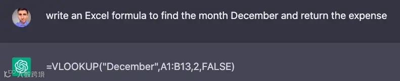 特别是对于一些复杂的函数,如果我们记不清其参数格式,就可以让 ChatGPT 帮忙写出正确格式,例如 VLOOKUP: