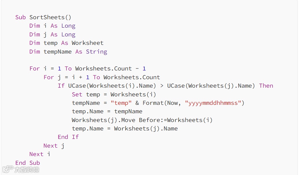 接下来让我们尝试使用 VBA 创建一个简单的宏,按 tab 名对 sheet 进行排序。