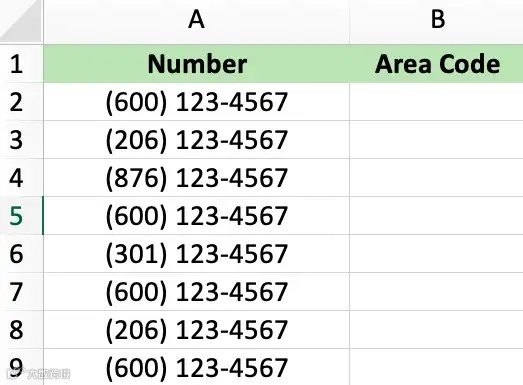 接下来挑战任务升级。假设我们有下面的电话号码列表,我们想要额外的区号(area code),即前面括号内容。