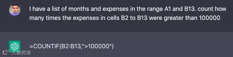 有时,我们对一个 Excel 表格有多个问题,这时我们也可以对 ChatGPT 连续提问。例如对于上面的收入支出数据表,想知道 1. 月支出超过 100000 美元的次数;2. 未支付的费用总计多少,我们就可以询问 ChatGPT 获得计算公式: