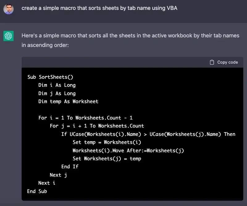 一番调试后,ChatGPT 完成了工作,但没有达到预期。除此以外,ChatGPT 通过 tab 名对 sheets 进行排序,它将其中一个 tab 名更改为 temp。