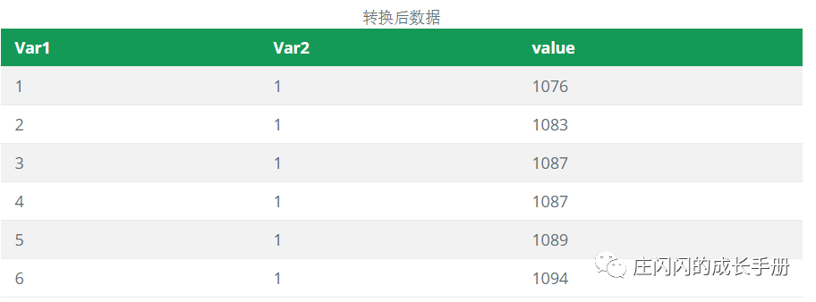 reshape2包中的melt()函数可将数据从左图转换呈右图的数据形式(下面图片可滑动查看!)。
