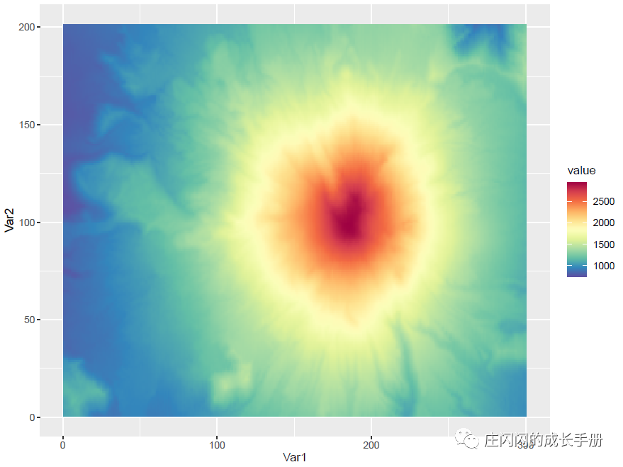 这里使用geom_tile()进行演示,将三维数据(x,y,z)中(x,y)表示位置信息,z映射到颜色。这里的scale_fill_gradientn()将颜色填充呈n个梯度。