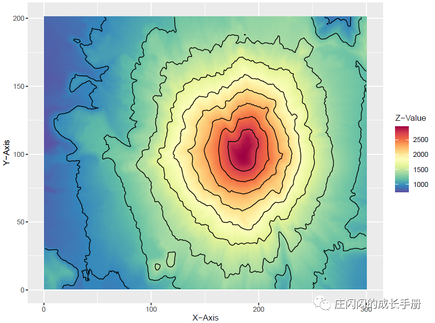 使用geom_contour()在上图基础上添加等高线,同一轮廓上的数值相同。