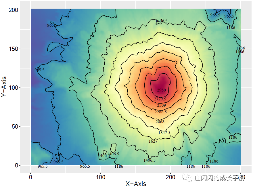 在上面的图基础上,利用directlabels包的direct.label()添加等高线的具体数值,从而不需要颜色映射的图例,同一轮廓上的数值相同。