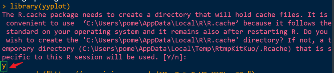The R.cache package needs to create a directory that will hold cache files. It is convenient to use ‘C:\Users\pome\AppData\Local\R\R.cache’ because it follows the standard on your operating system and it remains also after restarting R. Do you wish to create the 'C:\Users\pome\AppData\Local\R\R.cache' directory? If not, a temporary directory (C:\Users\pome\AppData\Local\Temp\RtmpKitKuo/.Rcache) that is specific to this R session will be used. [Y/n]: