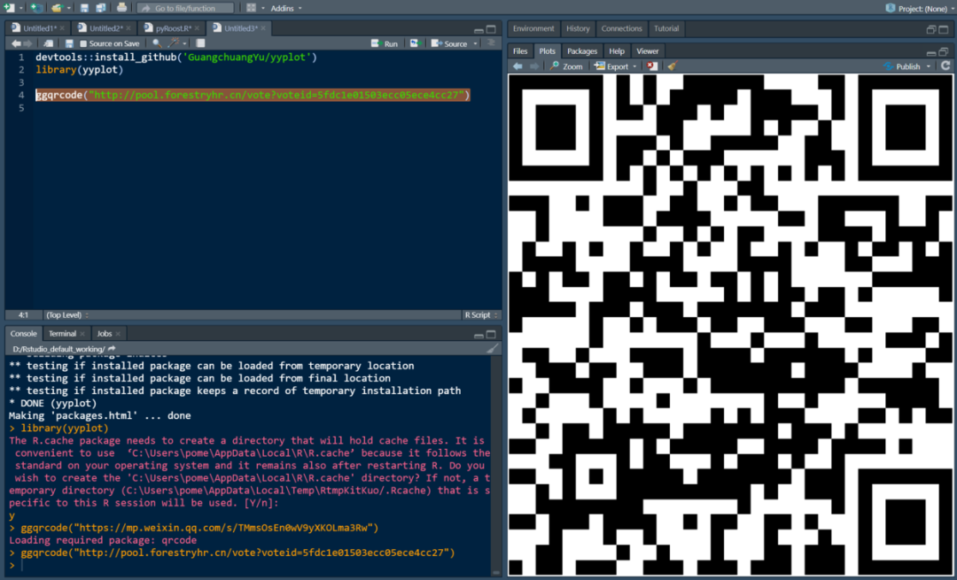 二维码成功画出来了,但是还是不能用,因为投票链接是一次性的,投完就失效了。yyplot这个包里还有一些其他的有用函数,大家可以自己研究一下!,看到这里的记得回去投票哈!