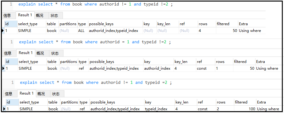 explain select * from book where authorid != 1 and typeid !=2 ;