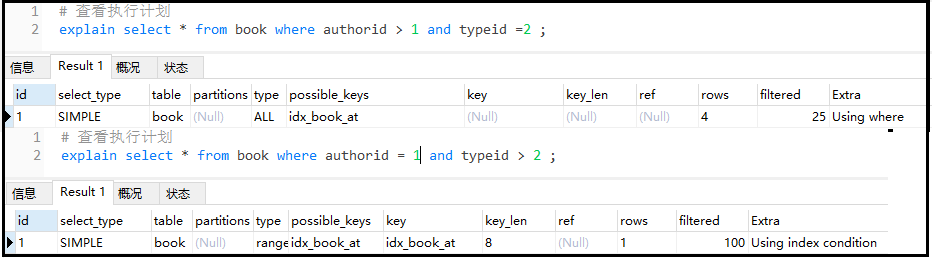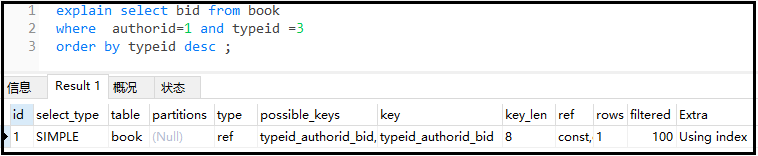 explain select * from book where authorid = 1 and typeid > 2 ;