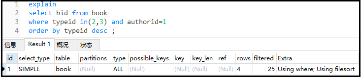 explain select * from book where authorid*2 = 1 and typeid = 2 ;