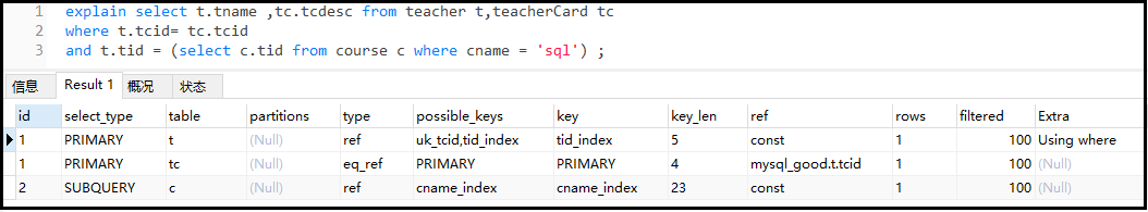 explain select t.tname ,tc.tcdesc from teacher t,teacherCard tc