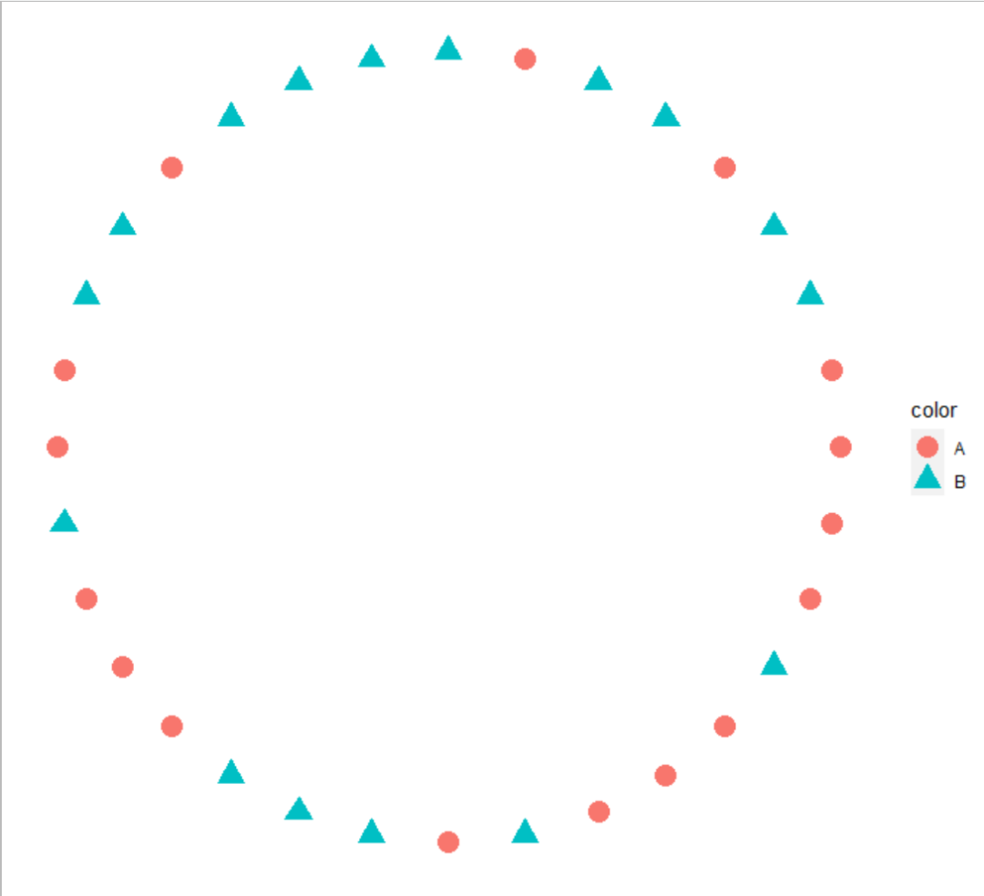 ggplot2包的geom_point()和geom_segment()函数应该可以比较方便的实现。因为是圆形的布局,所以散点的坐标直接用圆形函数来生成就好了。有了想法 下面实现一下。