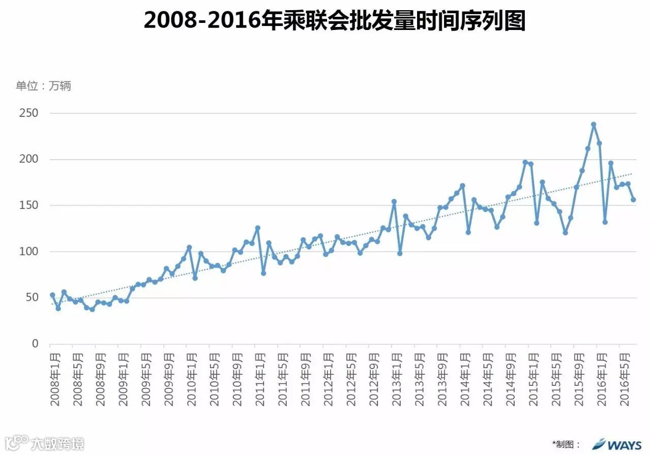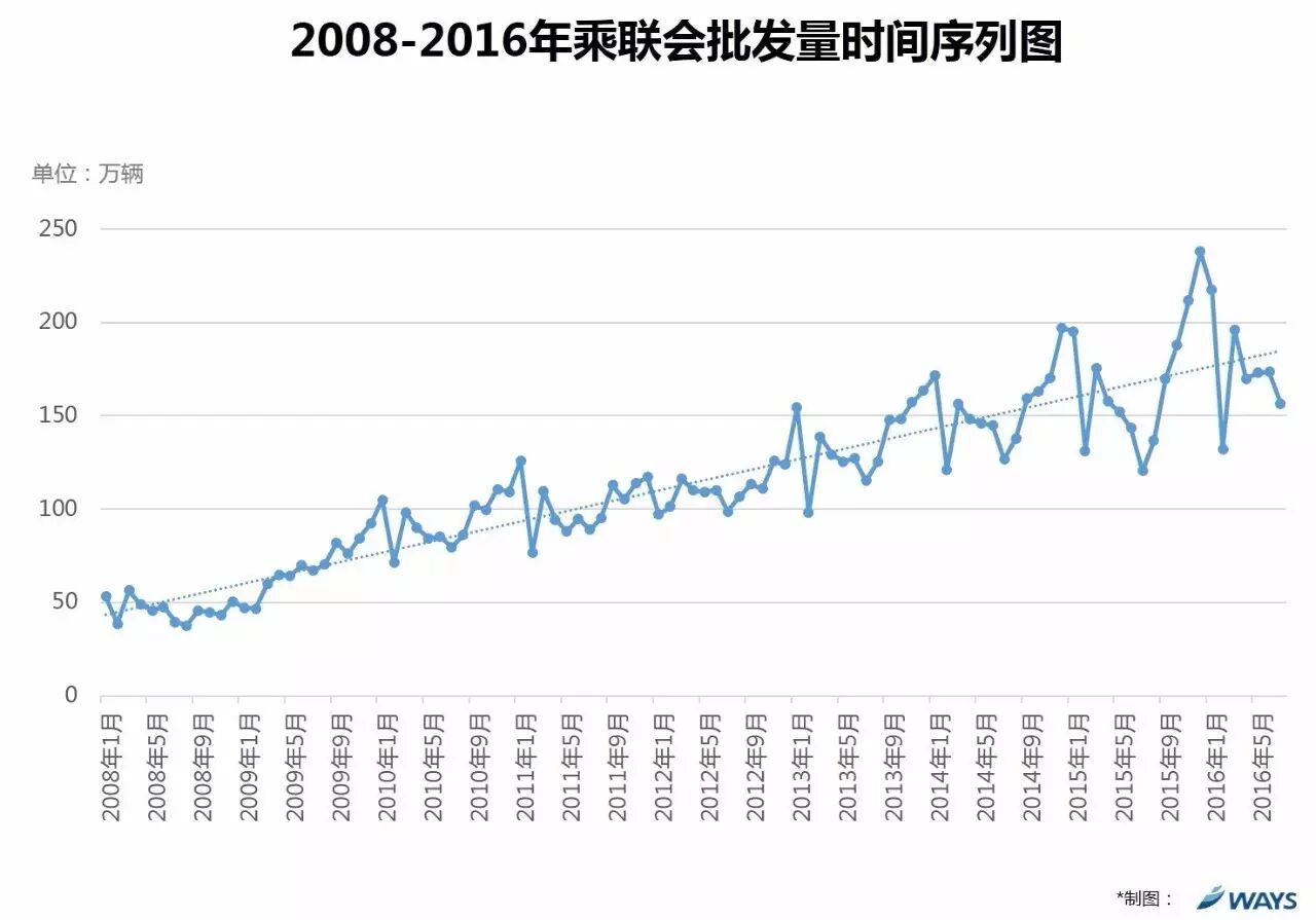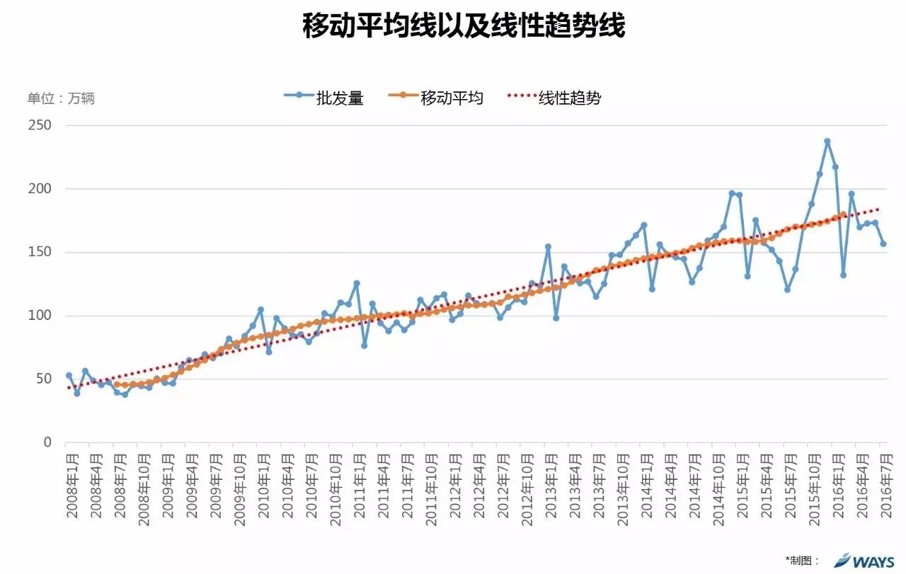 首先,我们来看一下2008年至2016年乘联会批发量的时间序列图。就酱紫看过去,数据貌似是无规律地在跳动,但认真地看下汽车批发量呈现整体上涨趋势的这个规律是存在的,因此我们可以借助12个月的移动平均线和线性趋势线(excel内选中曲线右键就可以轻松添加啦)进一步发掘其规律。