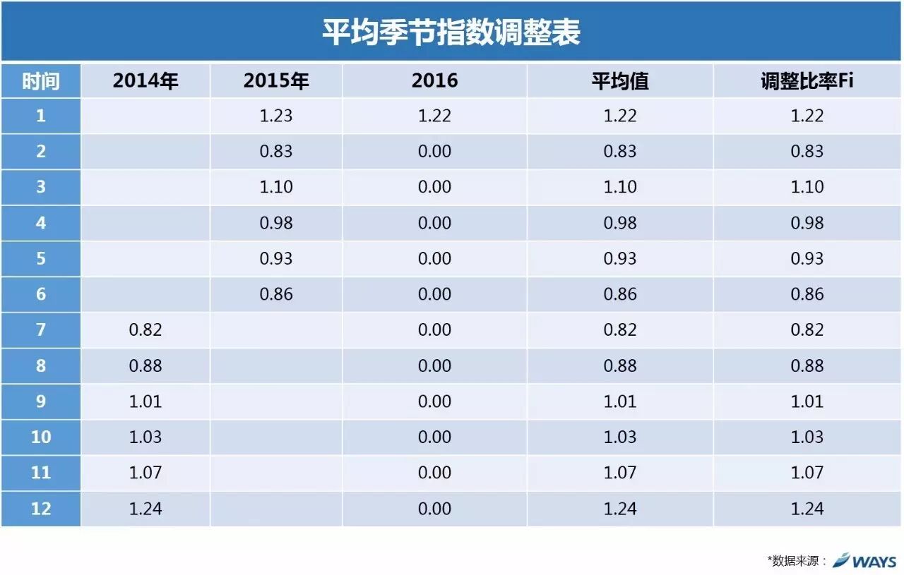 求调整季节指数Fi:将各年同期的季节指数求平均值,就得到调整季节指数Fi;