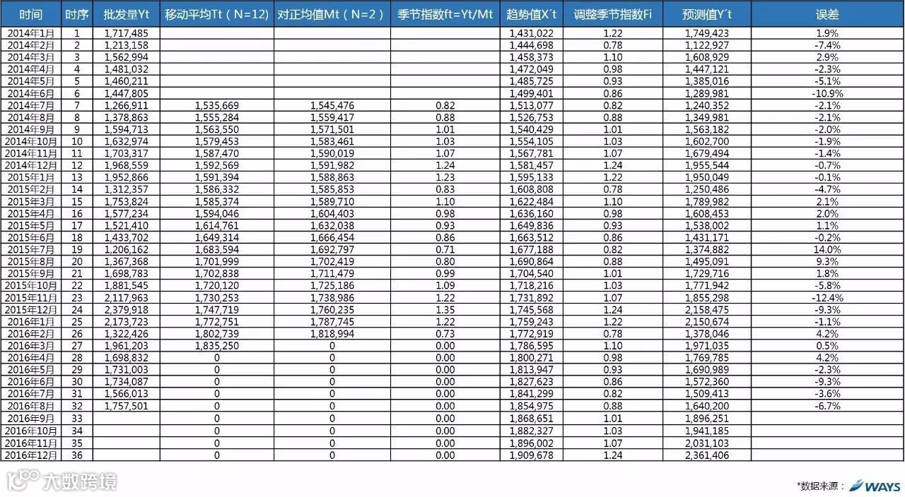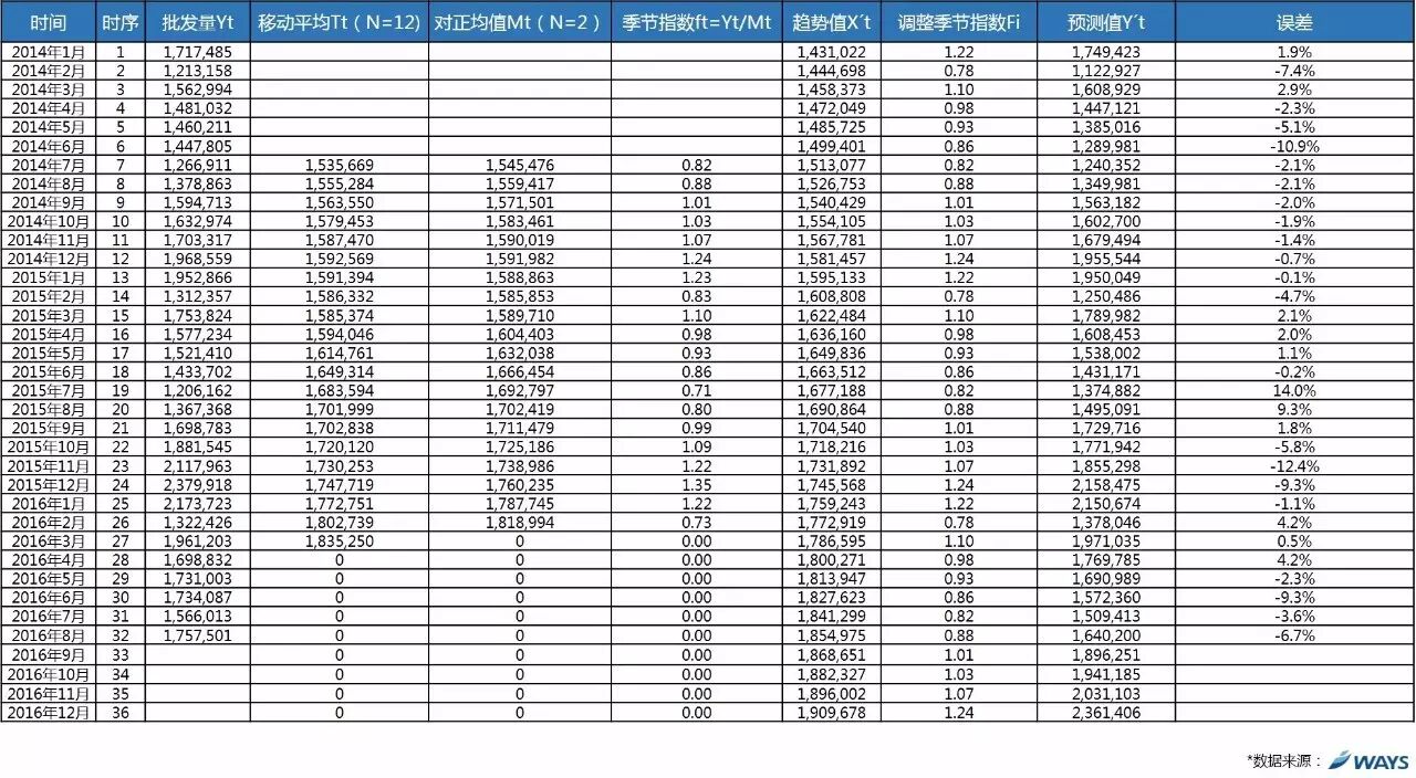利用excel绘制出这两条线后我们再次观察数据,发现批发量移动平均线和线性趋势线是有规律地呈现季节波动(两者也十分吻合)。并且季节波动因子呈现一定的时间段性,就是近几年的走势会比较接近(2010年前的季节波动和2012年后的波动规律就有较大差异),这也决定了此方法只能应用于短期预测。
