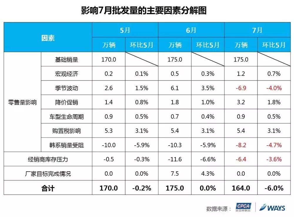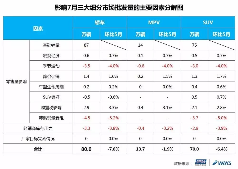 在各因素共同作用下,7月整体乘用车市场在基础销量上减少6.0%,其中韩系销量受阻、库存压力、季节性下滑分别造成-4.7%、-3.6%、-4.0%的影响,是影响7月汽车市场的主要因素。