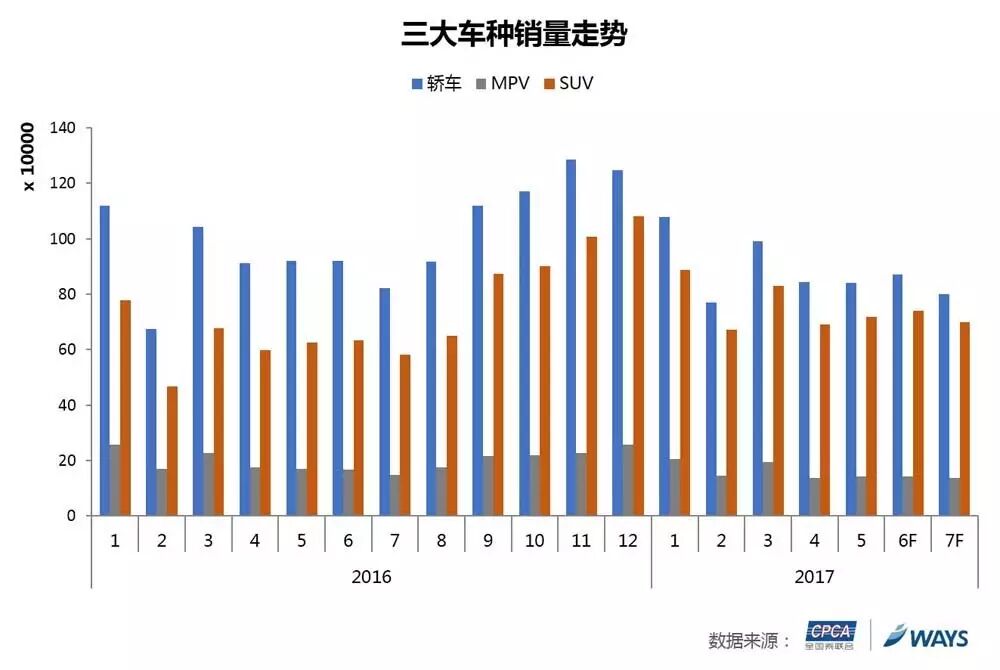 根据全国乘联会与威尔森的联合预测,7月整体乘用车市场批发量预计为:164万辆(*注:销量预测基于乘联会含出口的狭义乘用车批发量数据口径),同比2016年7月增长4.7%。其中轿车市场80万辆,同比萎缩2.8%;MPV市场13.7万辆,同比萎缩8.1%;SUV市场70万辆,同比增长20.1%。
