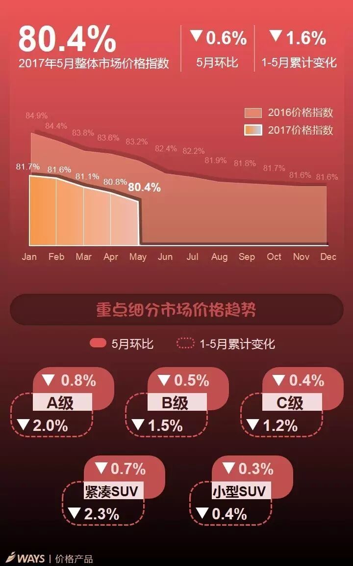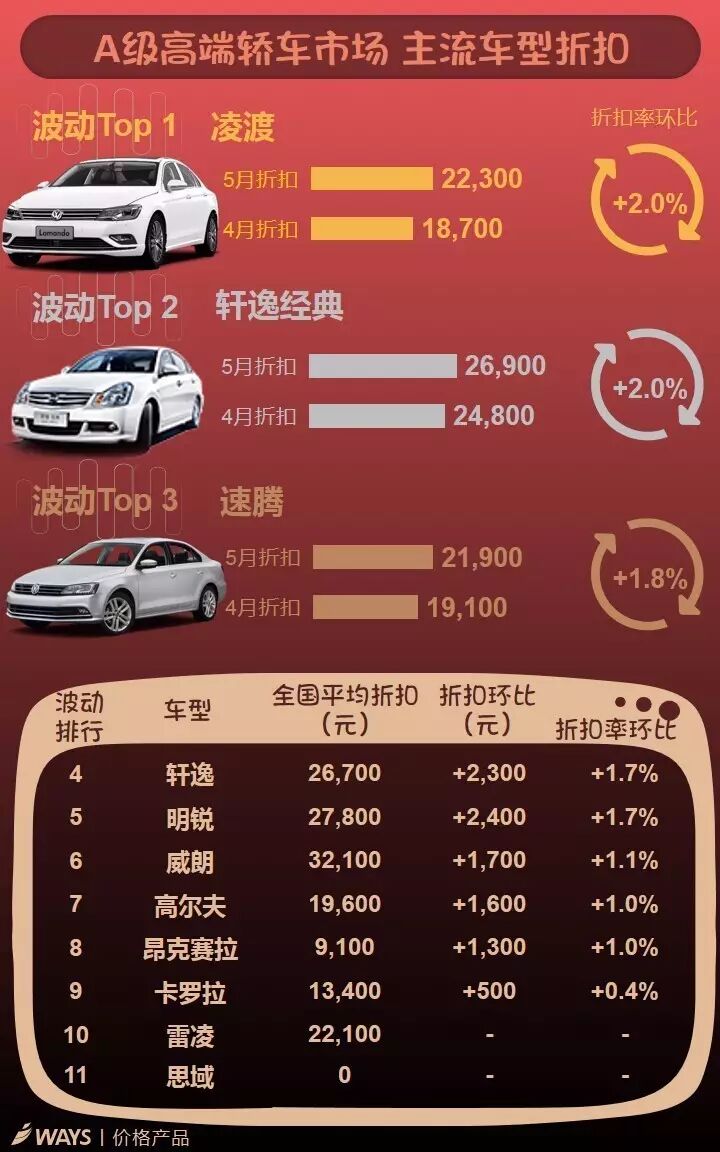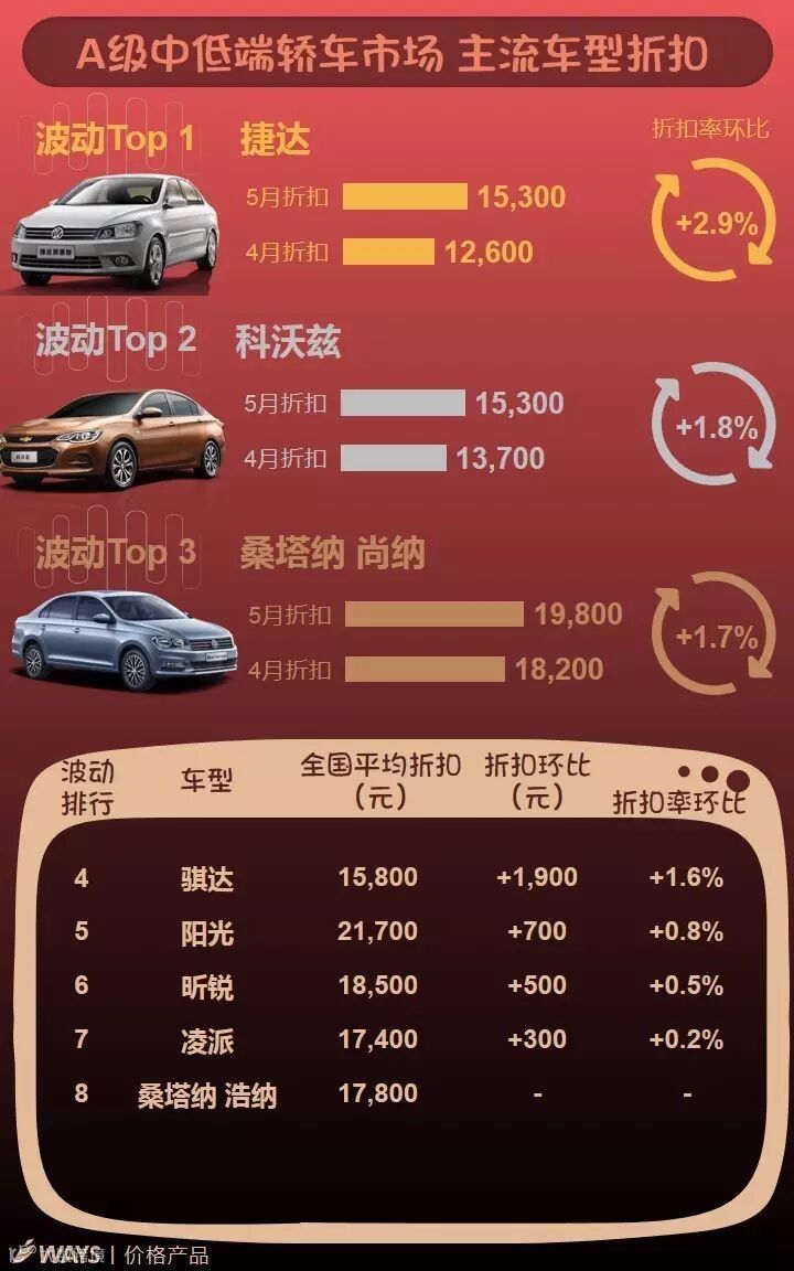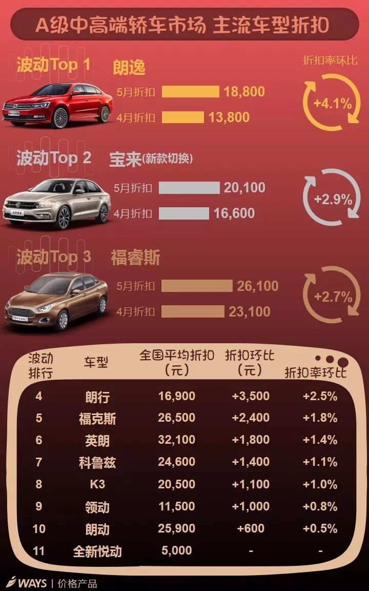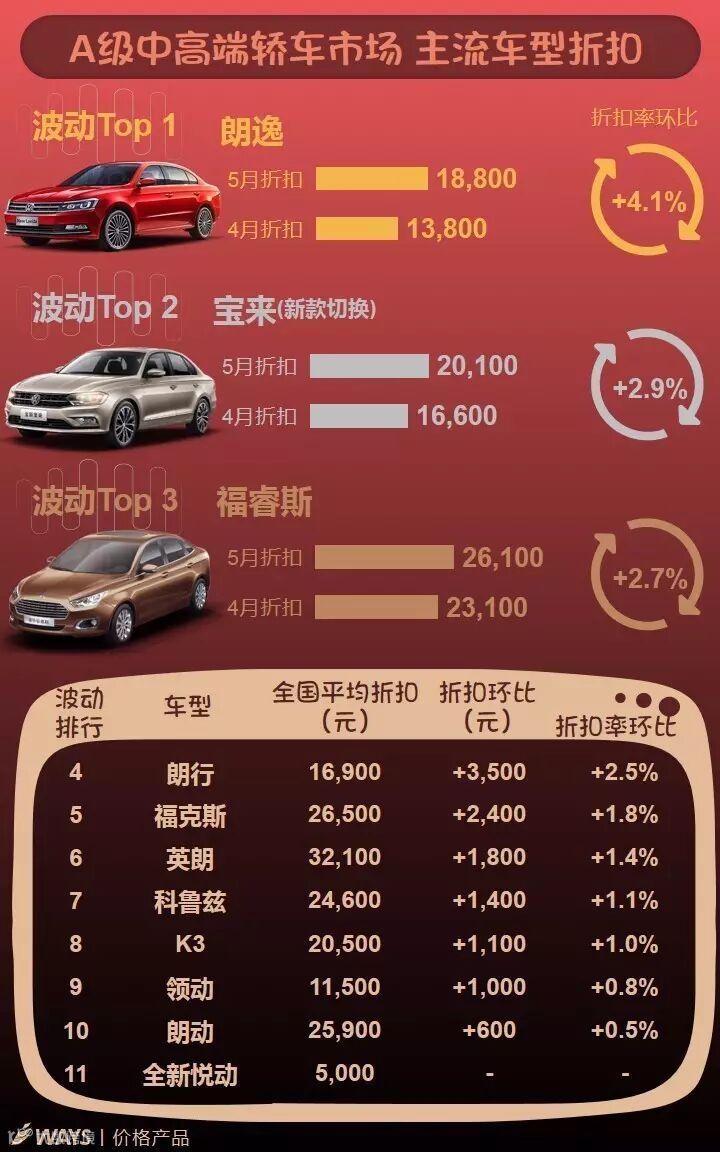 其中,受大众主要车型朗逸、宝来、捷达、凌渡等降价以及福特福睿斯、福克斯促销增加影响,A级细分市场价格下降明显,5月累计降幅继续扩大至0.8%。