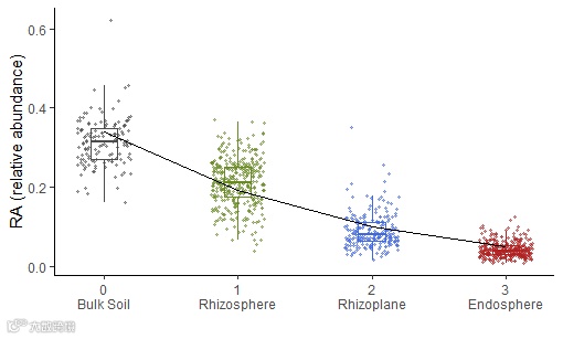 如存在疑惑,不妨绘制散点图展示土壤、根际、根表或根内所有样本中Acidobacteria相对丰度的分布,并通过R函数predict()拟合各土壤-根系微尺度区域下期望的Acidobacteria相对丰度后,将拟合值添加在图中以折线连接以形象可视化Acidobacteria相对丰度由土壤到根系的降低趋势。