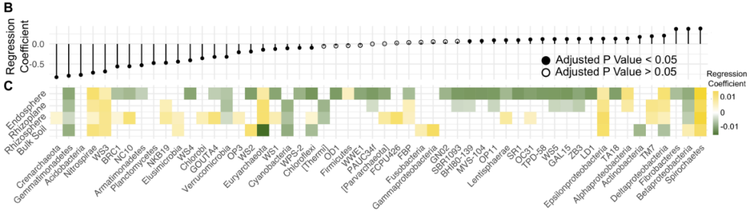 为了明确在细菌门水平上,是否存在特定微生物类群表现出被水稻根系富集或排斥的模式,使用beta回归对它们由土壤-根际-根表-根内(由根外到根内)的相对丰度进行了建模(图2B)。beta回归通过R包betareg执行,各细菌门的相对丰度在这里就作为响应变量对待,选择beta回归的原因就是考虑到各微生物的相对丰度都代表了其来自总微生物群落的相对比例,都是分布在 (0, 1) 区间内的比例数值,beta回归将更加有效。土壤、根际、根表、根内这4个空间微尺度区域是一组有序的类别型自变量,作者对它们分配了一组有序的离散值指代:土壤0、根际1、根表2、根内3。在55个细菌门中,共确定了从根的外部到内部空间分布明显不同的42个门(beta回归中的系数显著)。从土壤环境到根内部,相对丰度显著增加的有20个门(beta回归系数大于0),代表了它们被水稻根系富集。从土壤环境到根内部,相对丰度降低的有22个门(beta回归系数小于0),代表了它们被水稻根系排斥。根系排斥的细菌门的回归系数的绝对值总体上更大,表明只有少数比例的土壤微生物由根系富集。
