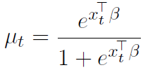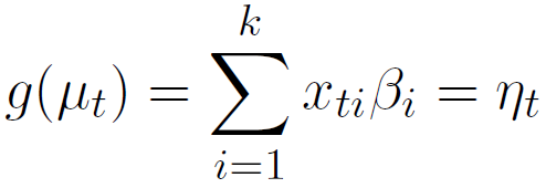 βi为各自变量xti的回归系数。连接函数g(.)存在多种选择,一个最为常见的连接函数是logit连接(logit link),在这种情况下: