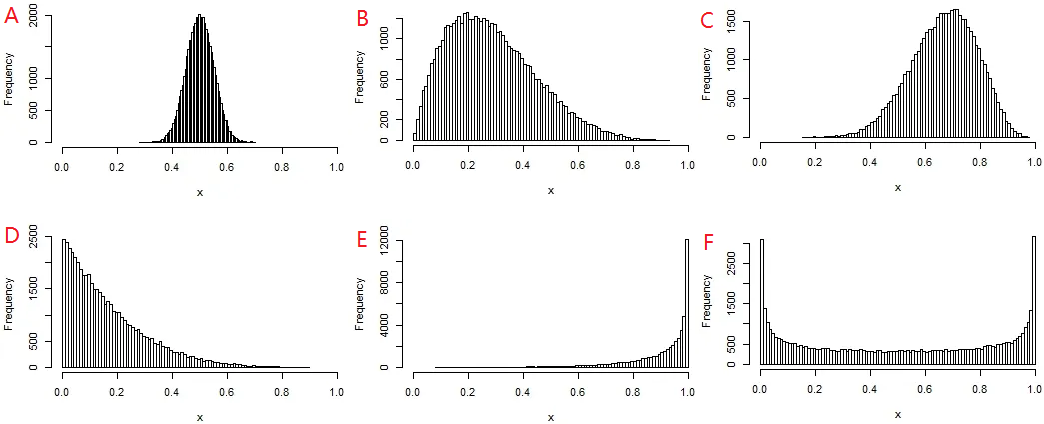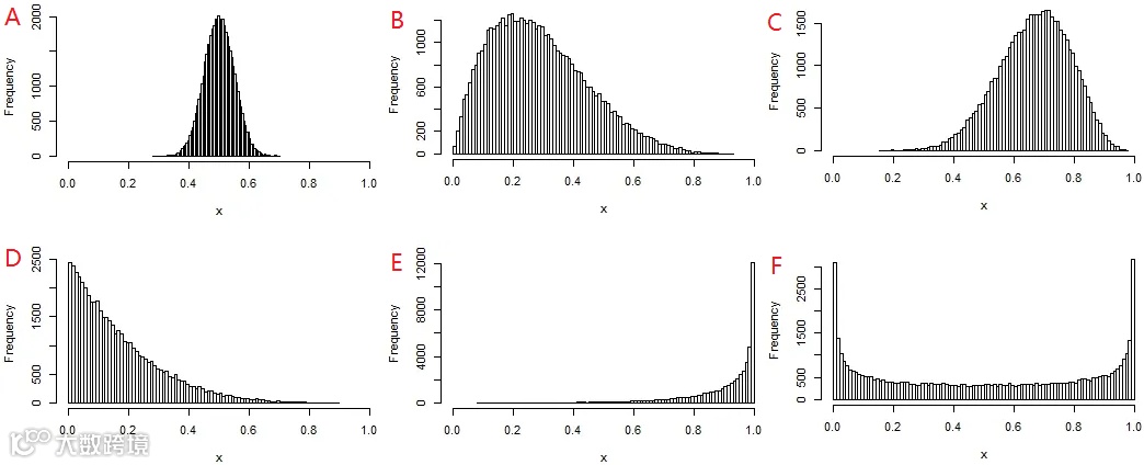 也可以看到,beta分布中某些状态大致与正态分布相同,例如A样式。常规的线性回归假定响应变量服从正态分布,对于呈现A样式beta分布的响应变量,或许可以通过一般线性回归进行参数估计。但若是D、E、F这种,线性回归将会产生较大的偏差。