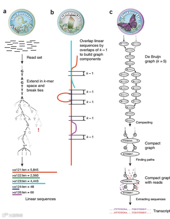 拼接的原理其实说得粗暴一点就是:谁像跟谁连。以无参转录组的老牌拼接软件:Trinity为例,稍微详细一点就是下面这样: