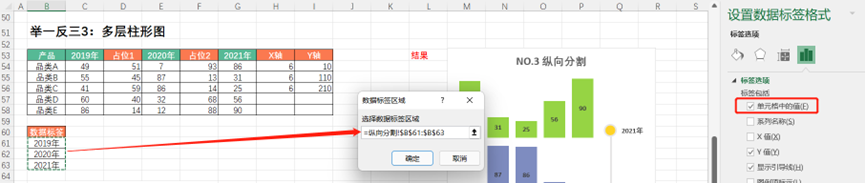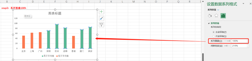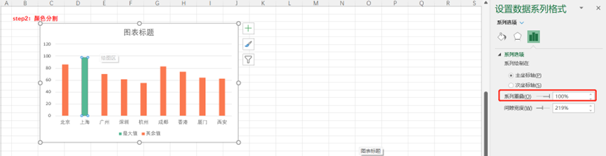 step3:设置颜色分割,系列重叠100%,插入数据标签(NO.1颜色分割作图步骤,不重复讲解)