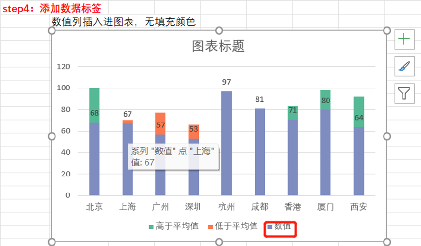 把数值这一列数据复制粘贴进当前图表,对数值所在的柱子添加数据标签即可,同时把数值的柱子设置为无轮廓,无填充,让其隐身。