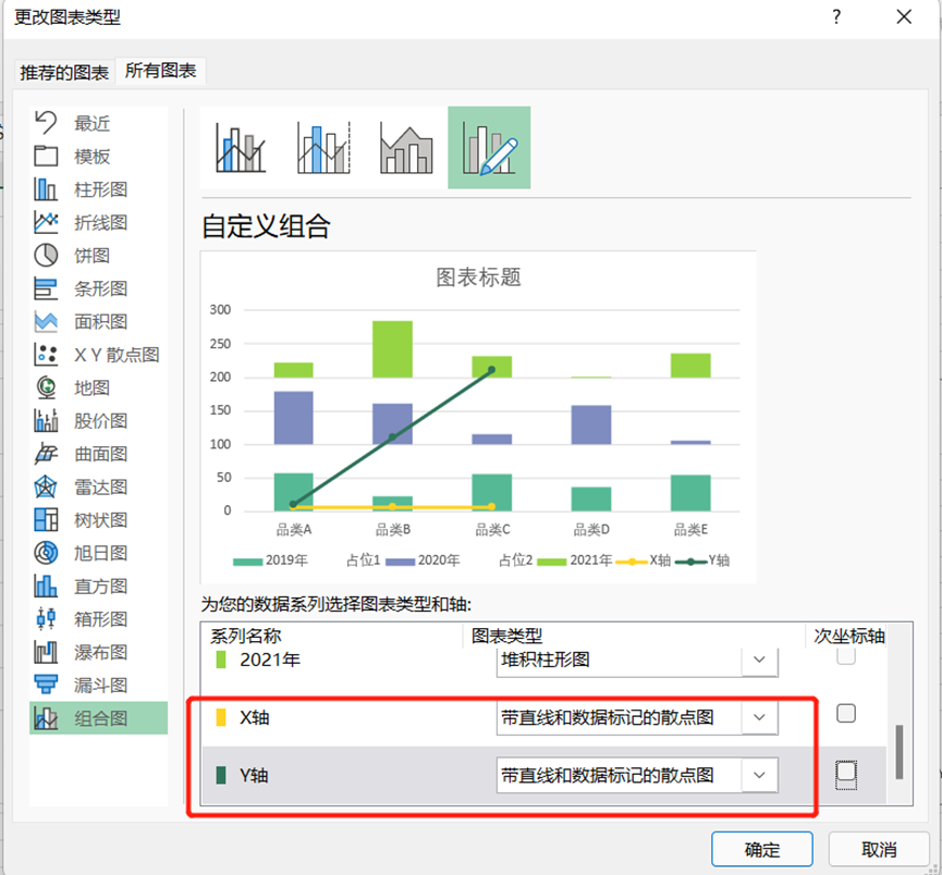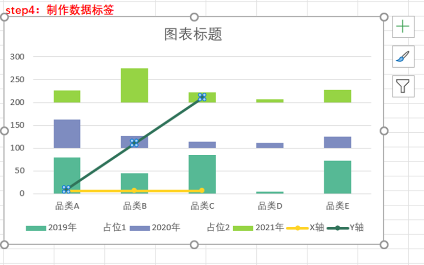 step4:制作数据标签。将X轴、Y轴插入到图表种去,更改图表类型,将X轴、Y轴改为带直线和数据标记的散点图。