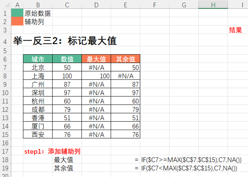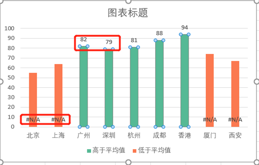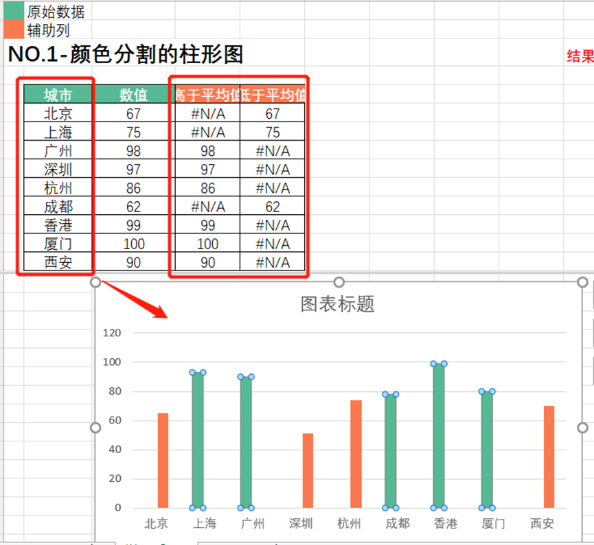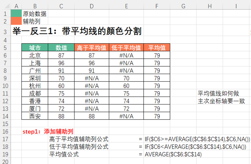 Step1:添加辅助列,添加两列辅助列,第一个辅助列,大于等于数值列平均值的为当前数值,否则为#NA,第二个辅助列,低于数值列平均值的为当前数值,否则为#NA。