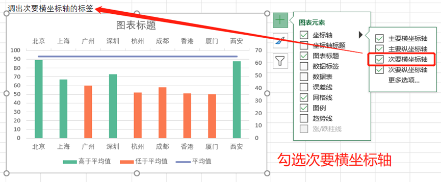 点击图表右边的+,在坐标轴中勾选次要横坐标轴,让其显示出来。