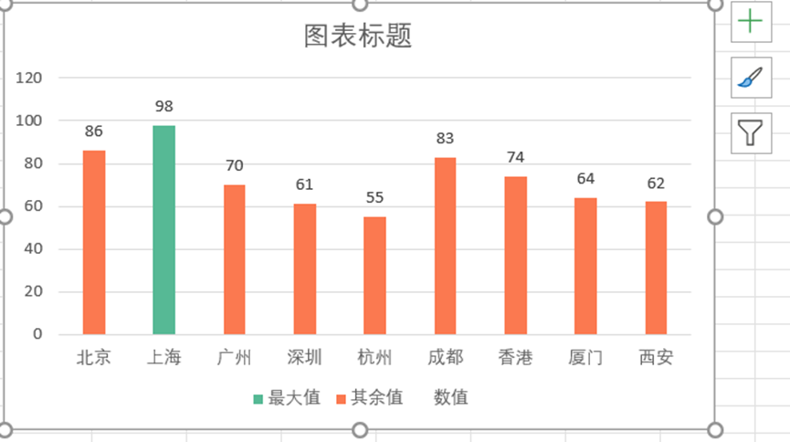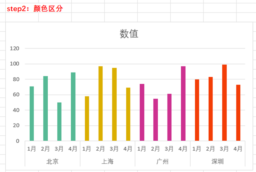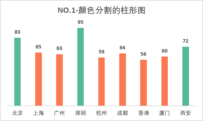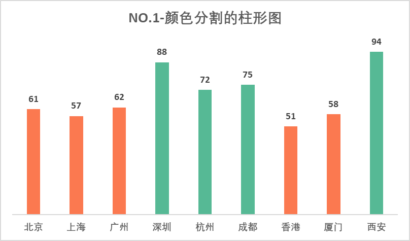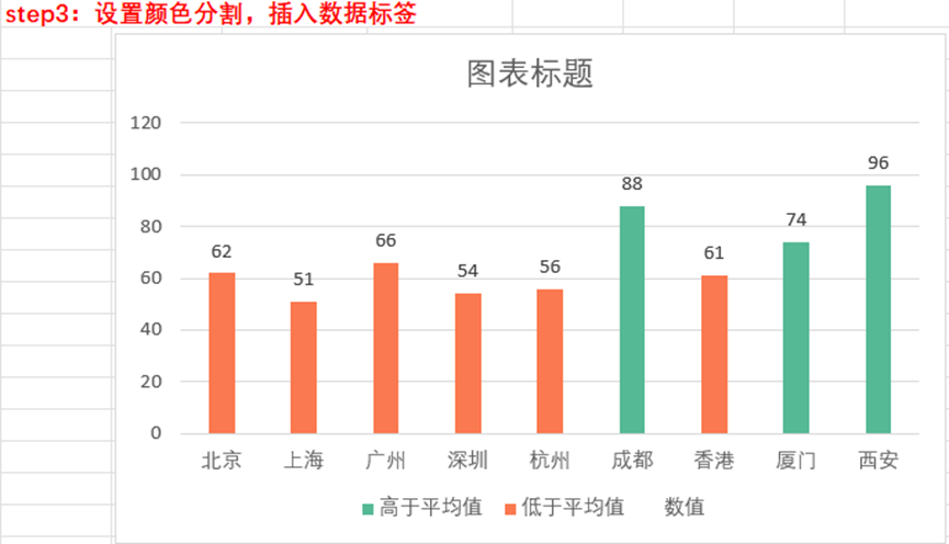 Step2:按上述方法进行颜色分割。线对城市和两个辅助列插入簇状柱形图,然后设置系列重叠100%,接着对数值区域复制粘贴到图表中,设置数据标签。