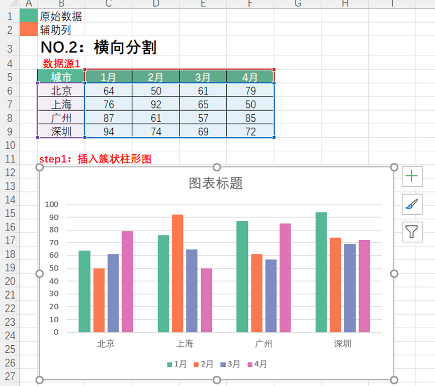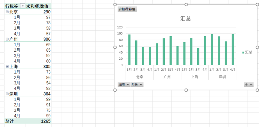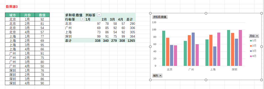 这类数据是很规范的可以进行透视的数据,那我们就直接对原数据插入数据透视表,行标签为城市,列标签为月份,就可以变成第一种数据源的形式,再插入透视图,即可得到同第一种数据源图表一样的横向分割的柱形图。