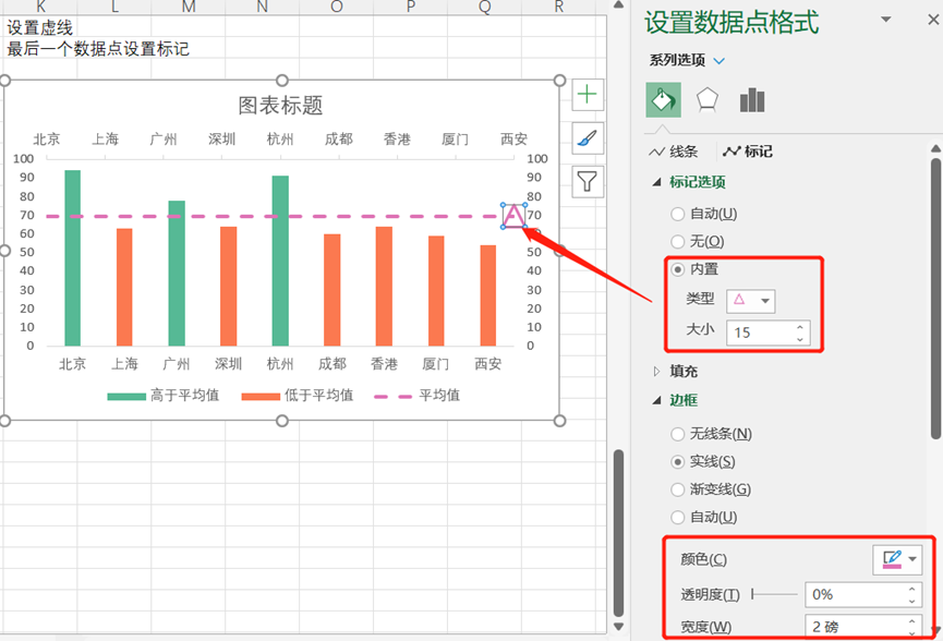 双击平均线的最后一个数据点,设置标记为三角形,大小15,边框粉红色加粗,无填充颜色。